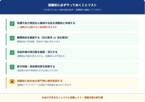 給付金を最大限受け取るためには、退職前の準備が非常に重要です。退職してからでは手遅れになるものがあります。