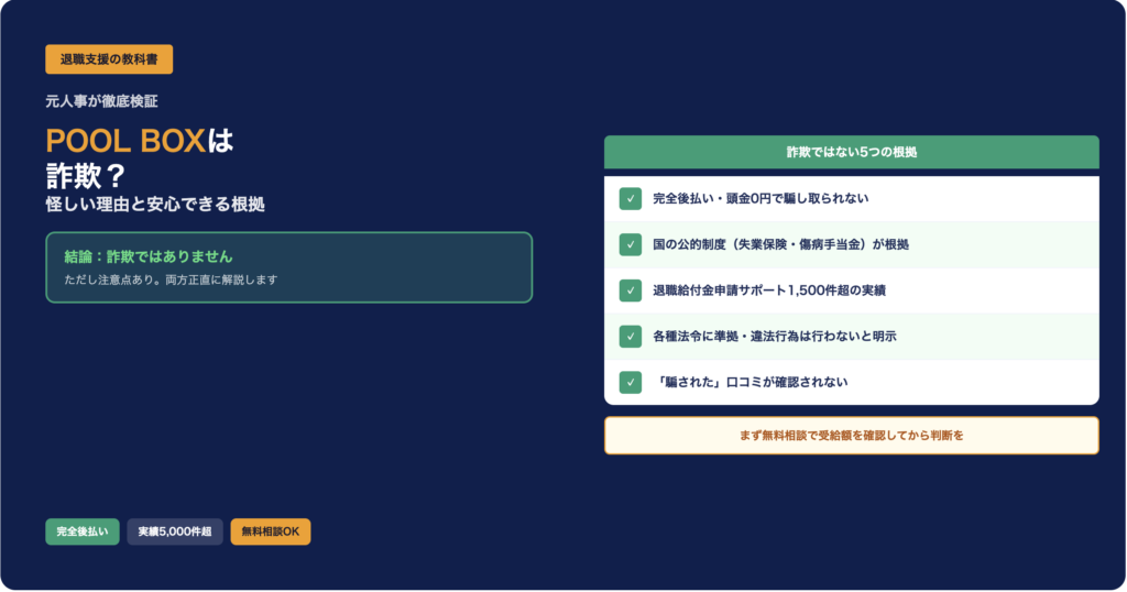 POOL BOXがサポートするのは、失業保険(雇用保険の基本手当)・傷病手当金(健康保険)・再就職手当など、全て国が定めた公的給付金です。制度自体は本物です。POOL BOXはその申請手続きをサポートするサービスであり、制度を偽っているわけではありません。