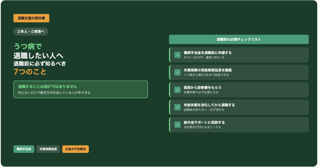 この記事では元人事担当者として、うつ病で退職を考えている方・ご家族に向けて、退職前に必ず知っておくべき7つのことをわかりやすく解説します。